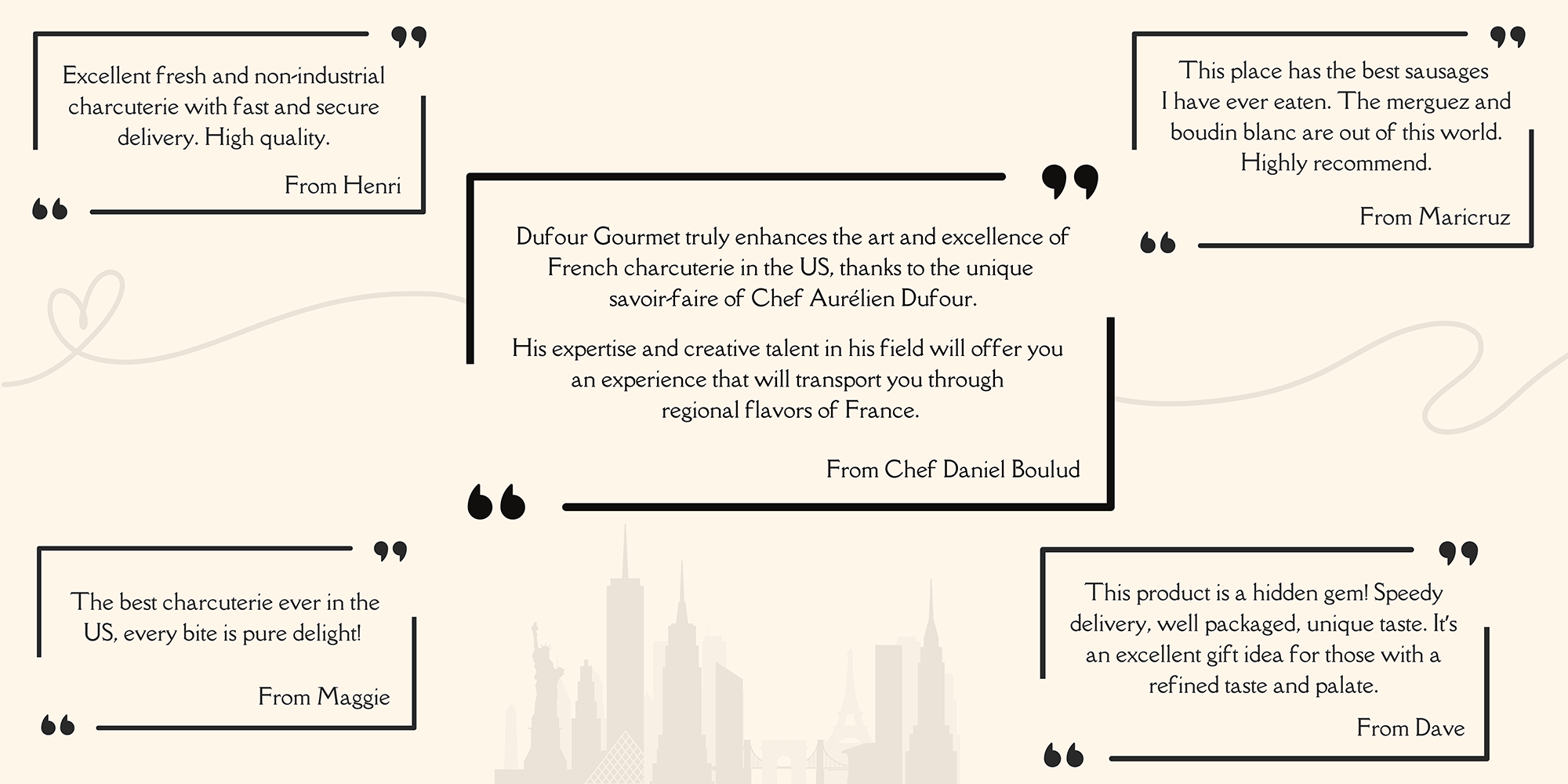 Each product is handcrafted with care by Chef Aurélien using traditional French techniques and the highest quality of meats. Chef Dufour sources from local farms that respect humane animal treatment practices and have strict quality standards (i.e. they never use artificial preservatives or additives). Our goal is to provide you with the highest quality charcuterie and delicacies possible.