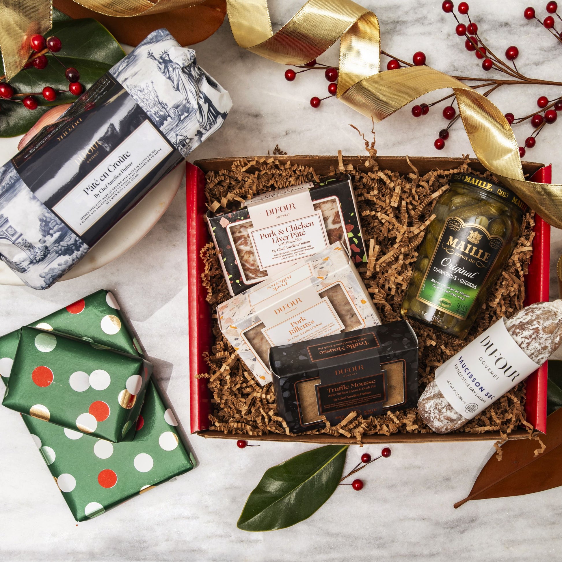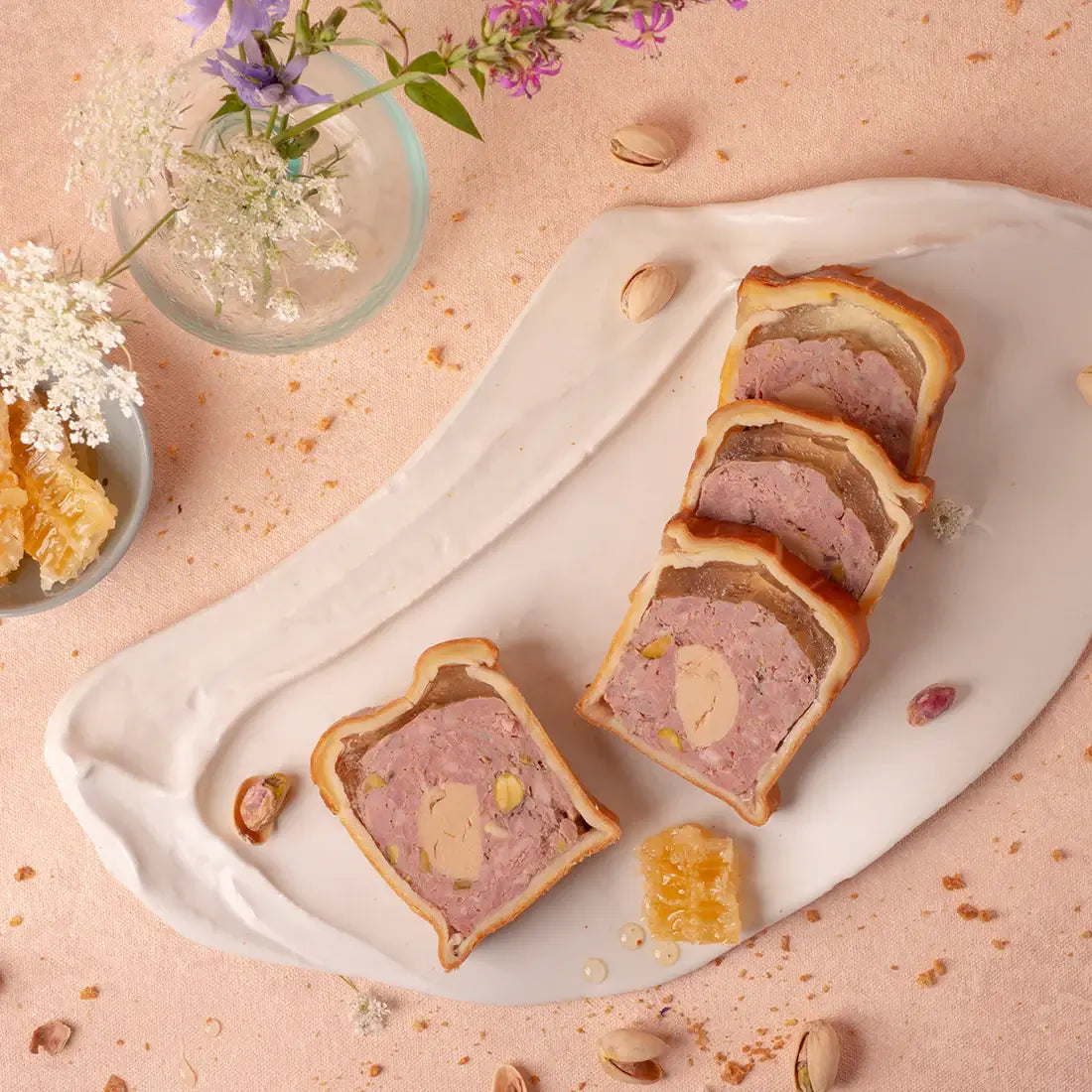 It includes the most famous and delicate Pâté en Croûte, a Pistachio Liver Pâté, a smooth Truffle Mousse, a moist Pork Rillettes, the delicious Saucisson Sec and French pickles Cornichons to complement those delicacies.